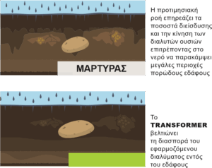 Το TRANSFORMER έχει την ικανότητα να μειώνει την επιφανειακή τάση του νερού. Όταν εφαρμόζεται στο έδαφος έχει σαν αποτέλεσμα τη βελτίωση των βασικών υδραυλικών ιδιοτήτων του εδάφους, όπως τη διήθηση, την αποστράγγιση, την υδραυλική αγωγιμότητα, την κατακράτηση του νερού στο έδαφος και την υδροφοβικότητα.